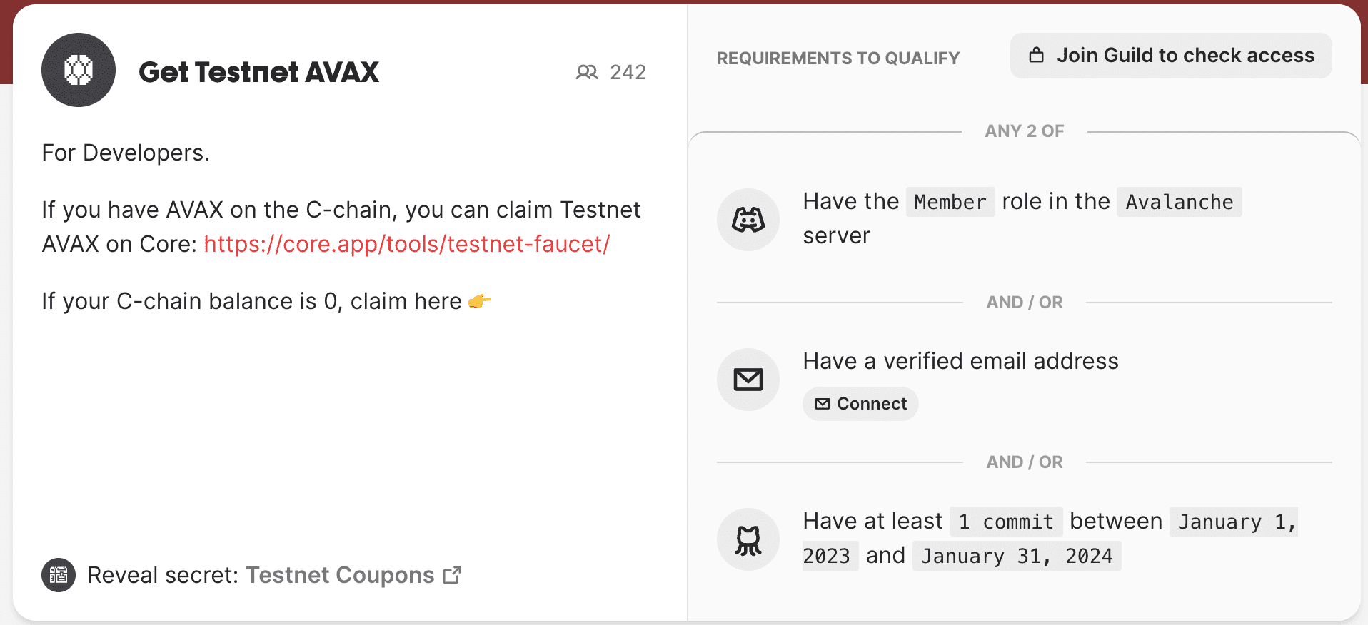 Otherwise, please request a faucet coupon on Guild. Admins and mods on the official Discord can provide testnet AVAX if developers are unable to obtain it from the other two options.